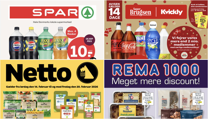 SuperBrugsen tilbyder Coca-Cola, Fanta eller Schweppes i flere varianter (125-150 cl) til kun 11 kr. pr. flaske. Husk pant oveni. Tilbuddet gælder fra fredag den 6. februar til torsdag den 19. februar 2026.